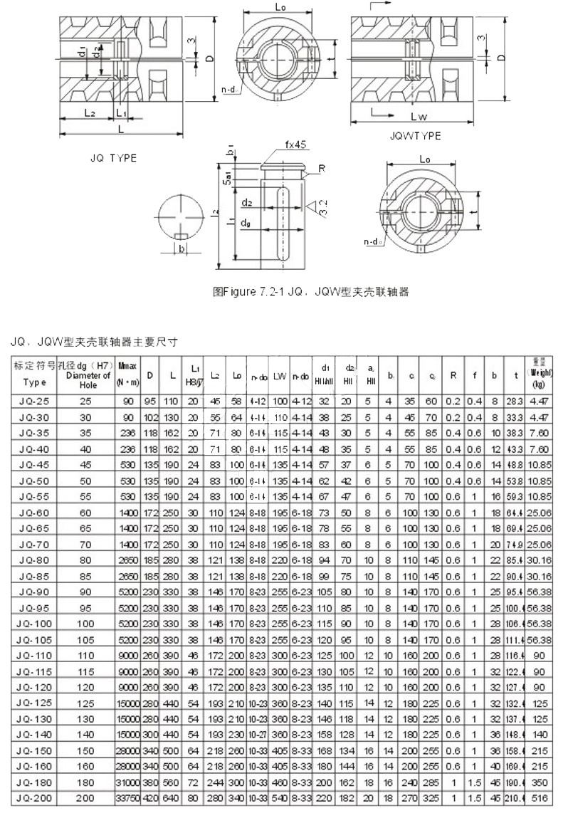 夾殼聯軸器由兩個沿軸向部分的夾殼組成。兩夾殼借擰緊螺栓時的夾緊力緊壓在被鏈接兩軸的表面上,實現兩軸的鏈接,并借兩半聯軸器與軸表面間的摩擦力傳遞扭矩。這種聯軸器通常還利用平鍵作輔助鏈接。夾殼孔中部及兩軸端均開有環形槽,并在其中安置兩個定位半環,實現聯軸器的軸向定位。為了平衡起見,相鄰螺栓頭部的方向應相反。為了使用,常需在夾殼外設置防護蛋。裝配時,由于每個螺栓的預緊力而使夾殼與軸的配合面間互相壓緊。裝配和拆卸時軸不需軸向移動,所以裝拆很方便,缺點是兩軸軸線對中精度低,結構和形狀比較復雜,制造及平衡精度較低,只適用于低速和載荷平穩的場臺,通常外緣的線速度不大于5m/s,當線速度超過5m/s時需要進行平衡校驗。為了平衡狀況,螺栓應正、倒相間安裝。不具備軸向、徑向和角向的補償性能