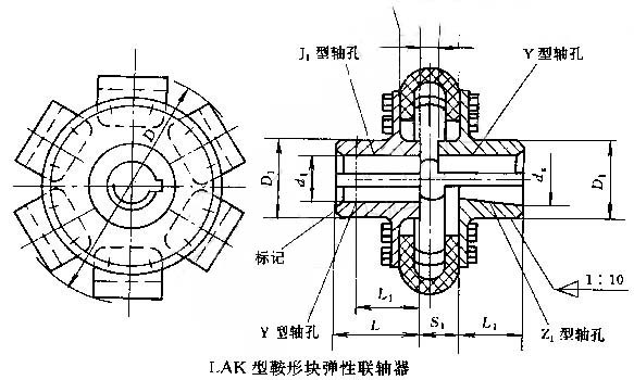 LAK型鞍形塊彈性聯(lián)軸器是由若千個鞍形橡膠塊通過螺栓與主、從動端半聯(lián)軸器聯(lián)接以傳遞轉矩。公稱轉矩為63-50000N.m,軸孔直徑為20-220mm.