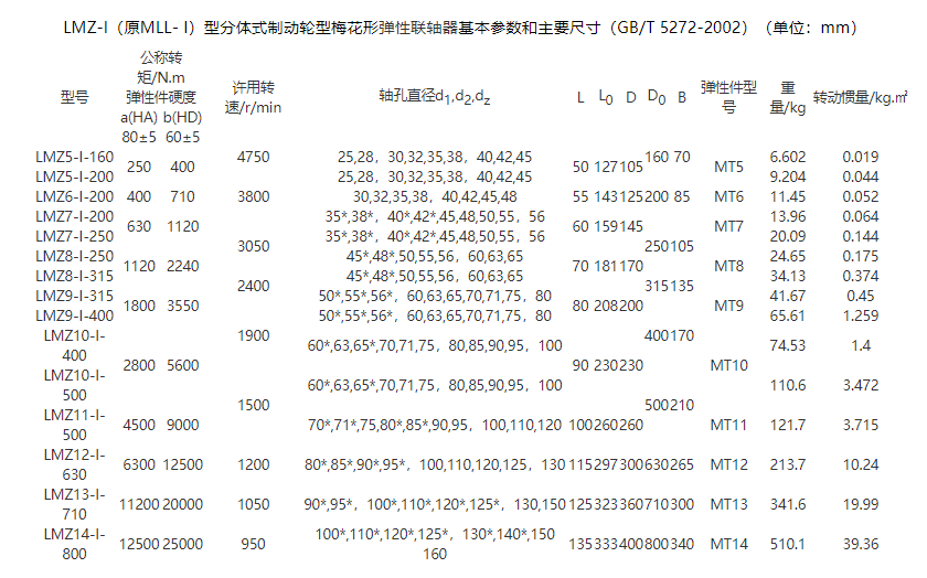 LMZ-I型分體式制動輪梅花型彈性聯(lián)軸器的適用范圍和性能特點.